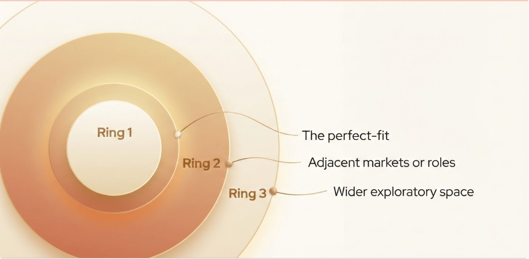 Ring 1 is the perfect fit. Candidates who hit every non-negotiable: the right background, the right market experience, the right seniority, the right commercial exposure. This ring might only contain twenty or thirty people. Work every single one before you move on.
