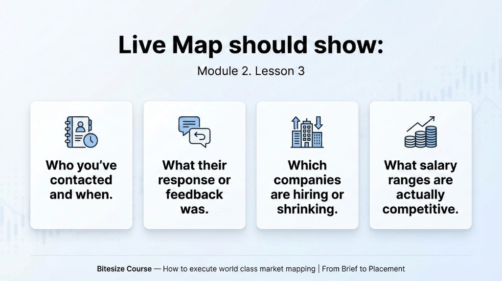 Over the course of a properly run search, this builds into something genuinely valuable. Certain companies keep producing the same objection, which tells you something about their culture or comp. Certain candidates keep referencing the same names, giving you a shortlist within your shortlist. Salary expectations start to crystallise, giving you real data to take back to your client about what's realistic.